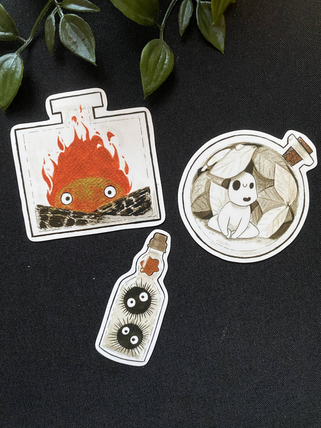 ✦ 3 Vinyl Stickers per pack (1x Kodama, 1x Soot Sprite, 1x Calcifer)